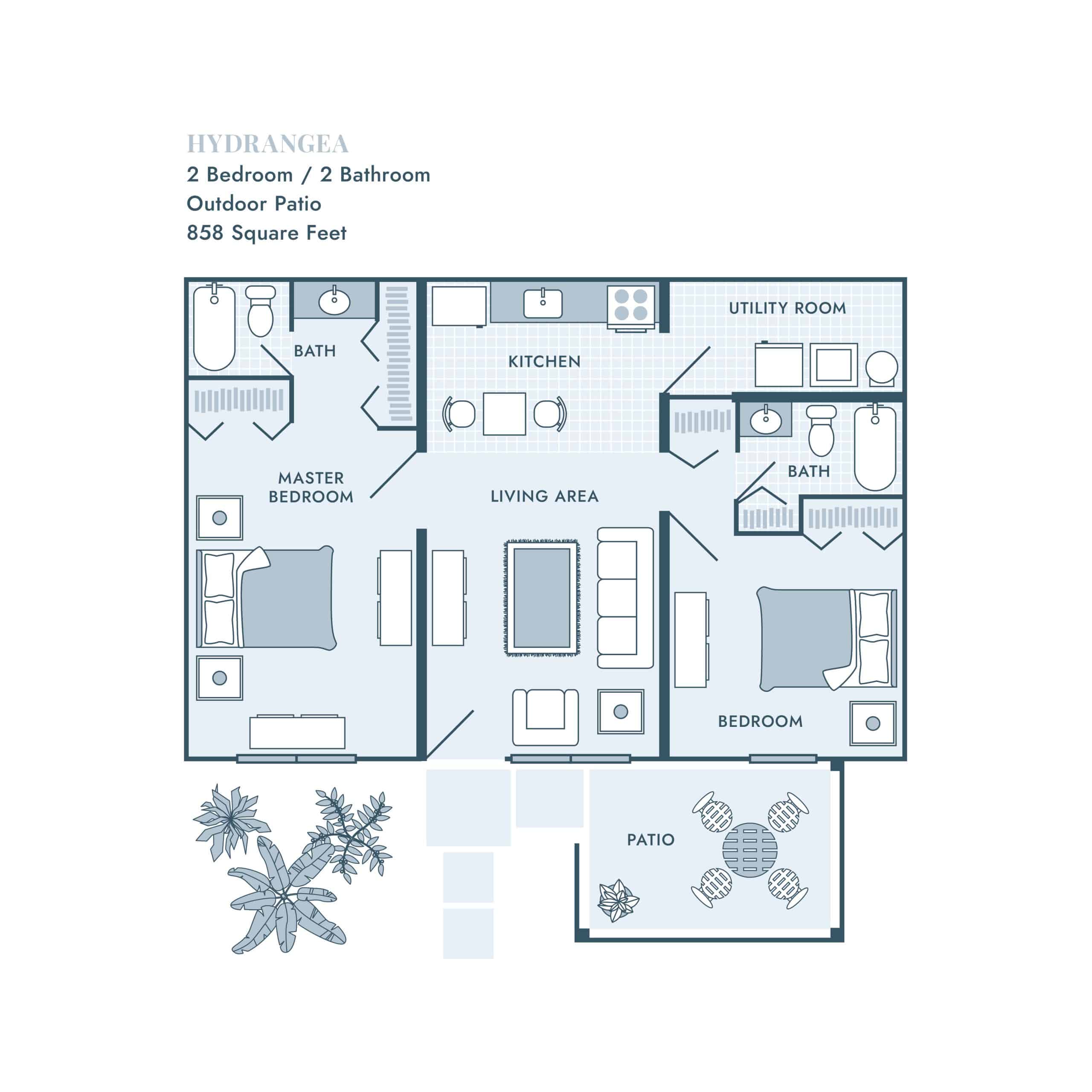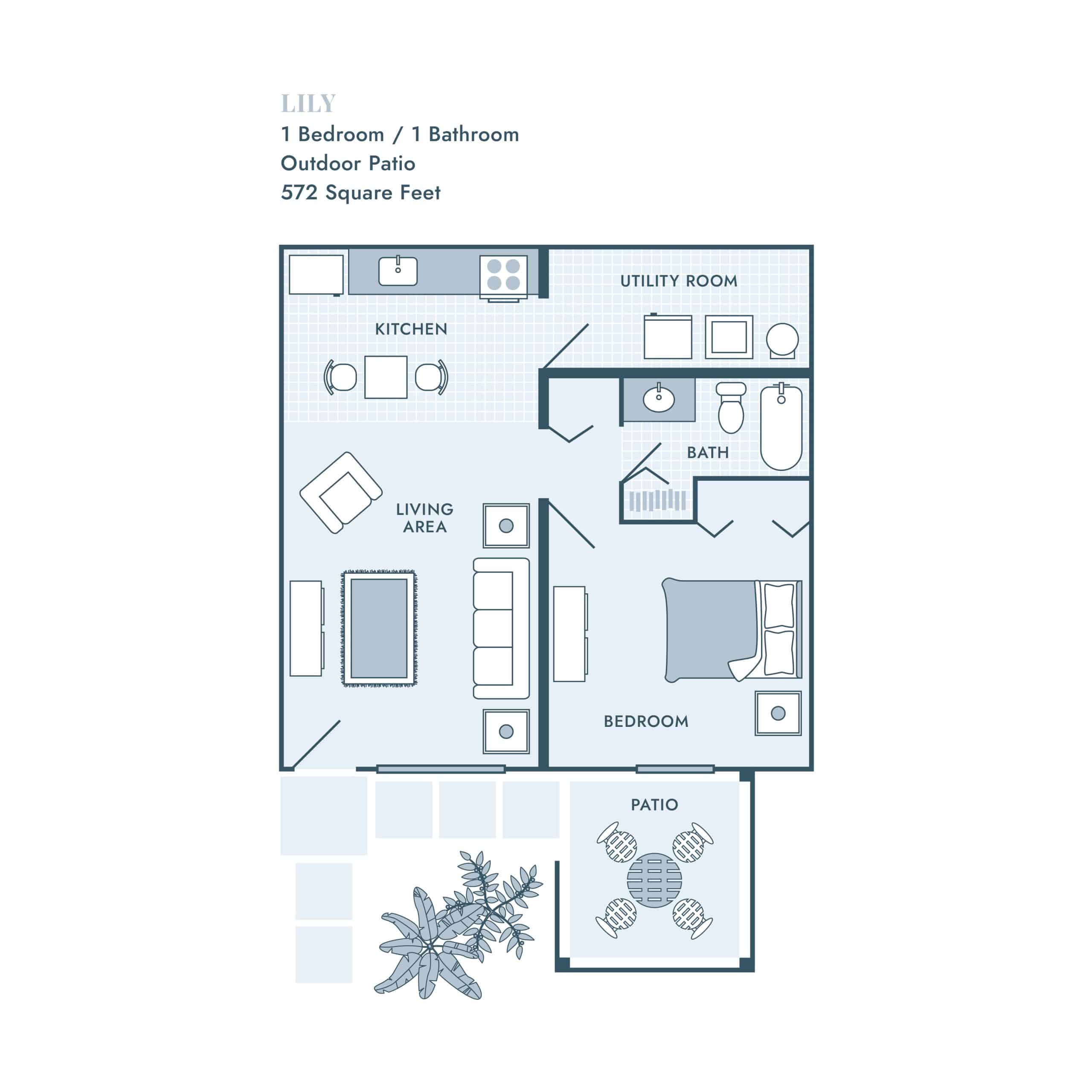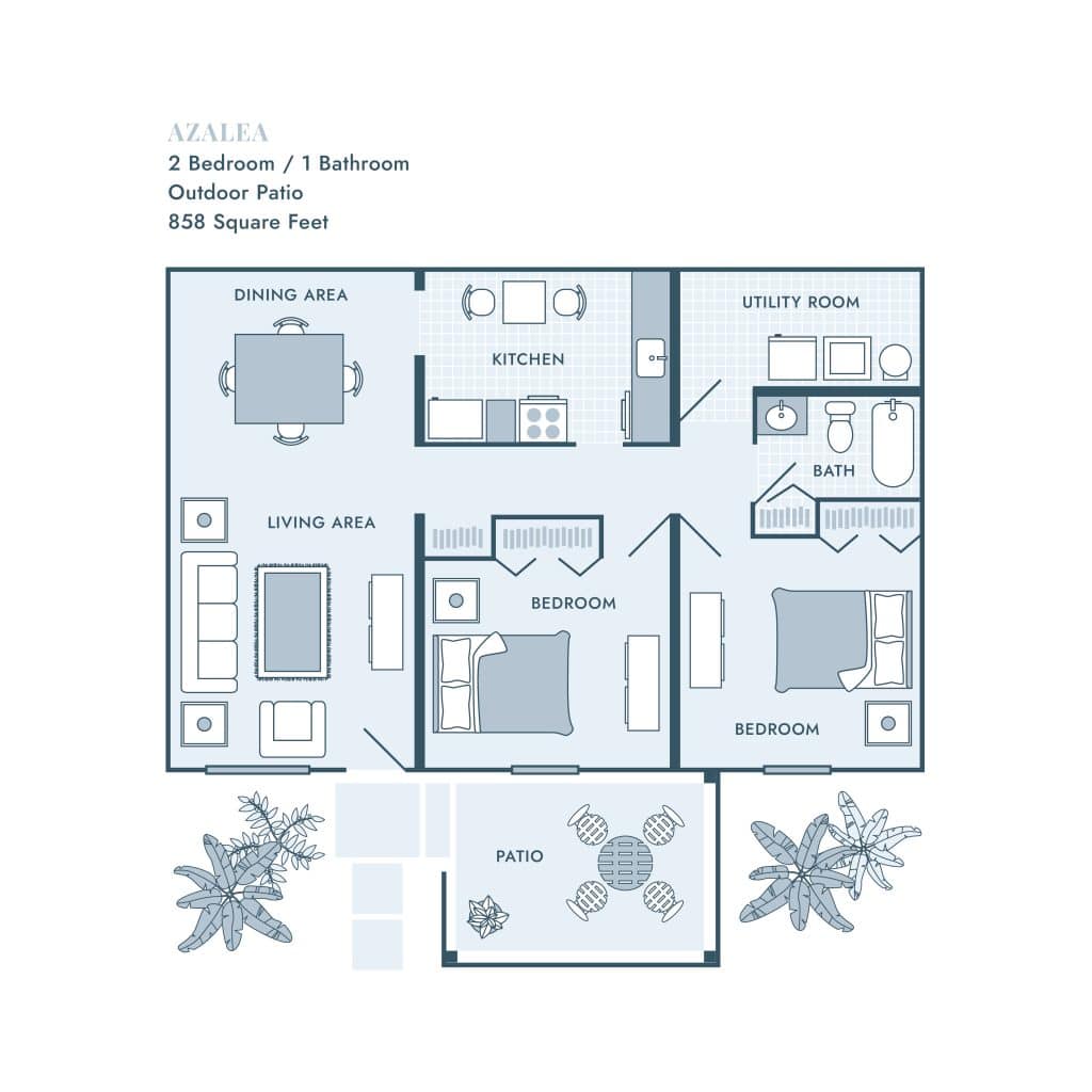 Our apartments feature open living areas, well-appointed kitchens, and plenty of storage space, including large utility rooms in every home. Private patios extend your living space outdoors, giving you a perfect spot for morning coffee or an evening wind-down.